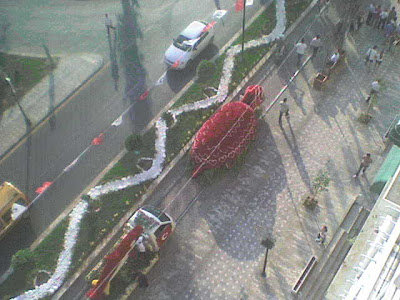Taalla on meneillaan 6:s kukkafestivaali.Olin siita nahnyt mainoksia,ja kokonaan unohtanut asian.Tanaan iltapaivalla alkoi kadulta kuulumaan musiikkia.Aivankuin soittokunta soittaisi,ajattelin.Aani laheni,ja riensin parvekkeelle katsomaan.Sielta se tuli,KUKKAİSMARSSİ,soittokunnan johdattelemana.(Ja edelleen vanha huono kannykkakamera kuvaamiseen.)Kulkueessa oli kukkasin koristeltuja autoja ja kukkasista tehtyja elainhahmoja.Autoista jakoivat kadulla kulkeville kaupunkilaisille kukkakimppuja.